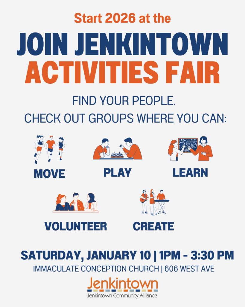 The Jenkintown Community Alliance invites the public to the first Join Jenkintown Activities Fair where Jenkintown residents and nearby neighbors of all ages can connect with clubs, groups and businesses that regularly bring people together in-person. Organization categories include health/fitness, the arts, learning, volunteering/civic engagement, games, socialization and beyond.